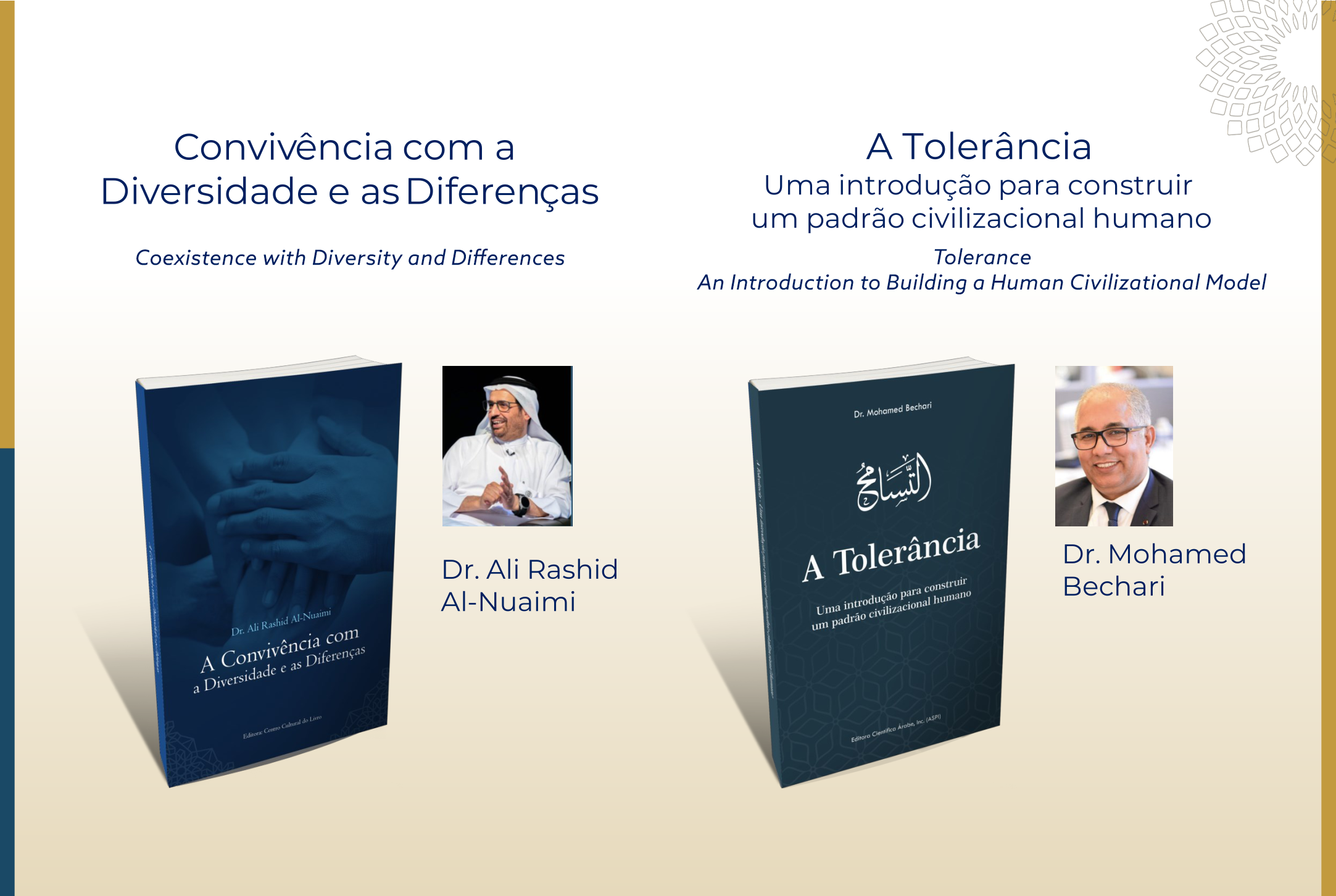 • A Convivência com a Diversidade e as Diferenças – de autoria do Dr. Ali Rashid Al-Nuaimi, presidente do Conselho Global de Comunidades Muçulmanas e ex-presidente da Universidade dos Emirados Árabes Unidos. Reconhecido por sua atuação na promoção do diálogo inter-religioso e de políticas de tolerância, Al-Nuaimi apresenta, nesta obra, uma visão moderna de convivência baseada no modelo dos Emirados Árabes Unidos, ressaltando o papel do diálogo e da pluralidade como pilares da paz e do desenvolvimento.